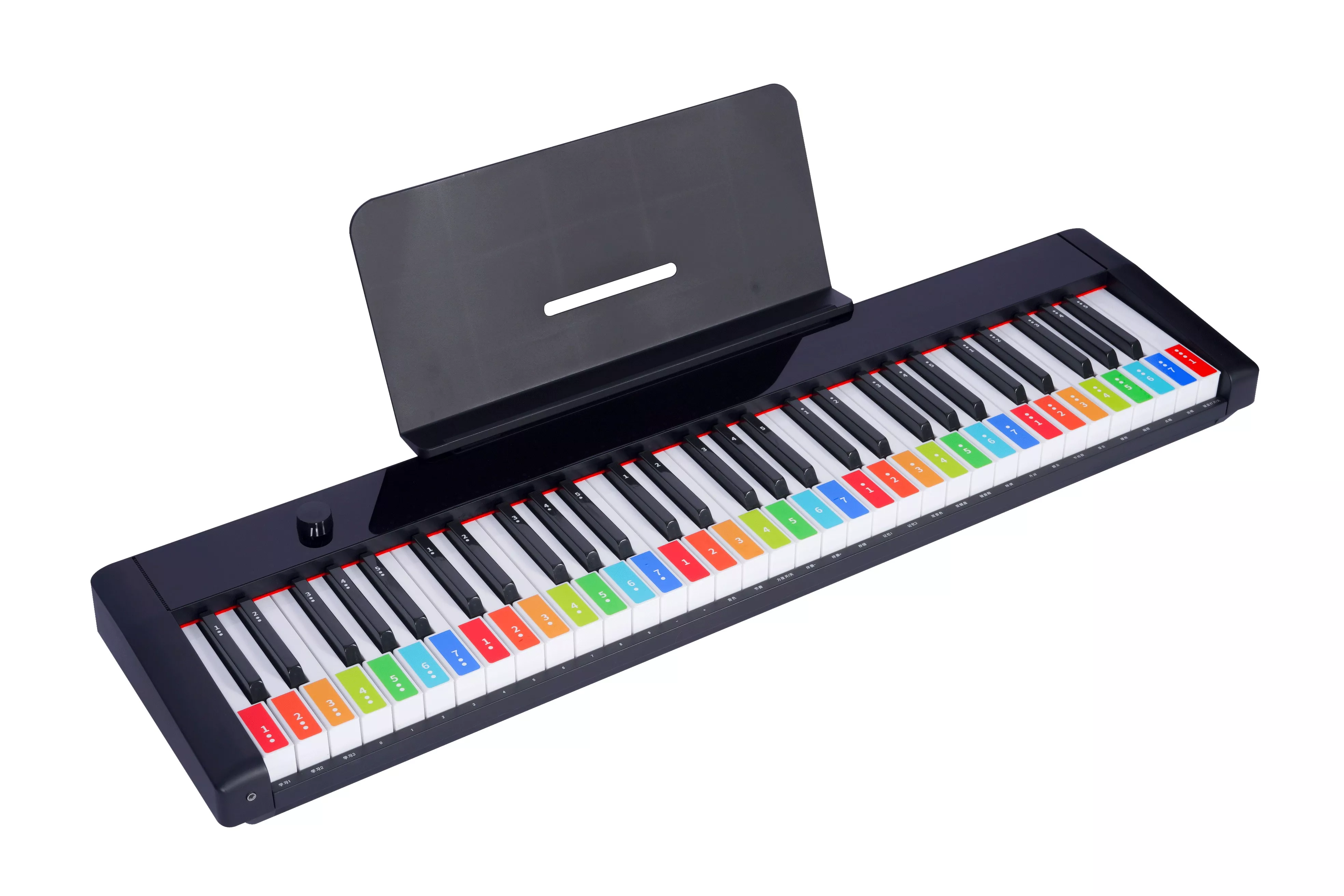 1.外型:便携式,触摸操控面板,双色LED智能灯。 2.键盘:61个标准力度彩色数字琴键。(带简谱数字1、2、3、4、5、6、7,更方便初学者辨认键位,快速上手)。 3.示范曲:100首经典示范曲,点唱,连唱功能。 4.触键力度:2种力度曲线,固定力度关。 5.音色:600种精选。 6.节奏:200种精选。 7.伴奏控制:自动和弦开关,同步启动,开始停止,插入,前奏 / 尾奏。 8.录音功能:录音,编程,回放功能。 9.音色控制:大三角钢琴音色,双钢琴,双音色、双键盘。 10.双音色:多重组合音色。 11.键盘分离:包含双钢琴,同音域可将键盘分割成两种相同音高的音区功能、四手联弹、弦乐重 奏、管乐合奏、钢琴 + 提琴,吉他 + 提琴演奏,可以实现多重组合。 12.音量控制:主音量,伴奏音量,夜间弹奏可调节音量控制,夜间弹奏免打扰。 13.记忆功能:2组记忆设置。 14.教学功能:三步教学功能(单键,跟弹,合奏)。 15.跟弹功能:双色LED灯智能跟弹。 16.移调:7档位,(0,-/+6)。