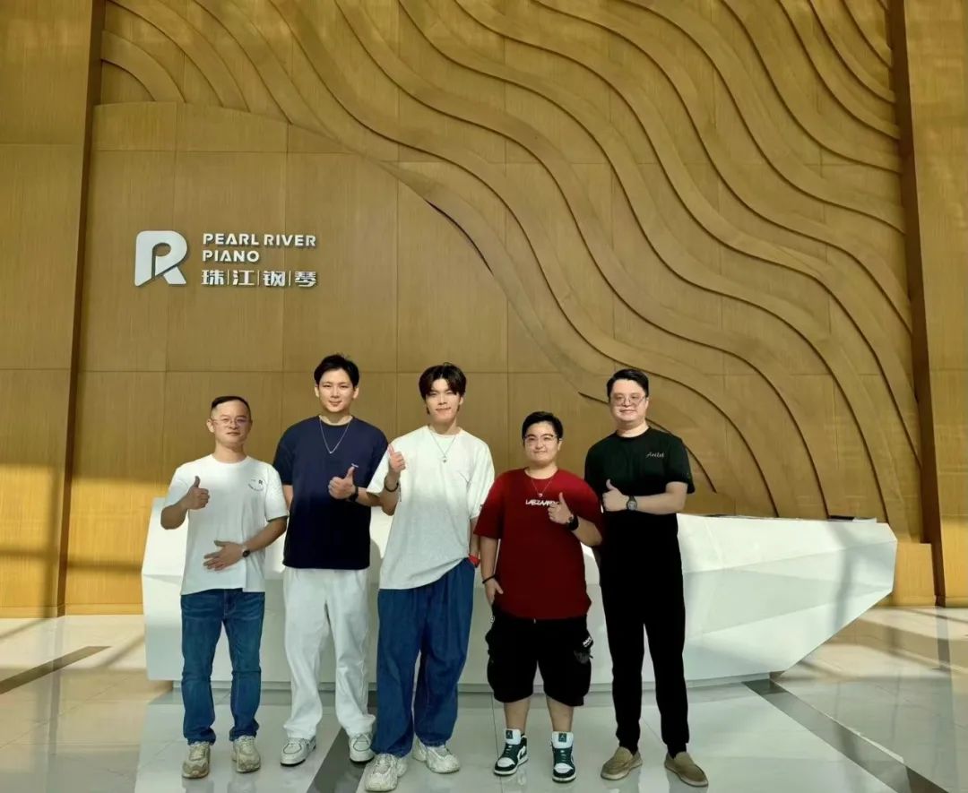 *英皇娱乐(广东)艺人宣传及业务发展总监与余浩斌莅临珠江钢琴集团参观指导。
